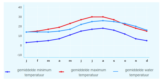Deze grafiek toont de gemiddelde minimum en maximum temperatuur en de gemiddelde zeewatertemperatuur op Mallorca.